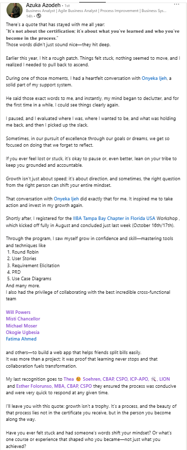 Cossi continues to provide value to the business analysis community through mentorship, operational support, and a commitment to excellence in every initiative he joins.